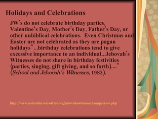 In addition Jehovahs witnesses do not celebrate due to various for instance the belief that holidays are based on the belief of other gods. Jehovahs Witnesses do not celebrate most holidays or events that honour people who arent Jesus. Jehovahs Witnesses do celebrate birthdays but not in the same way as most people do.